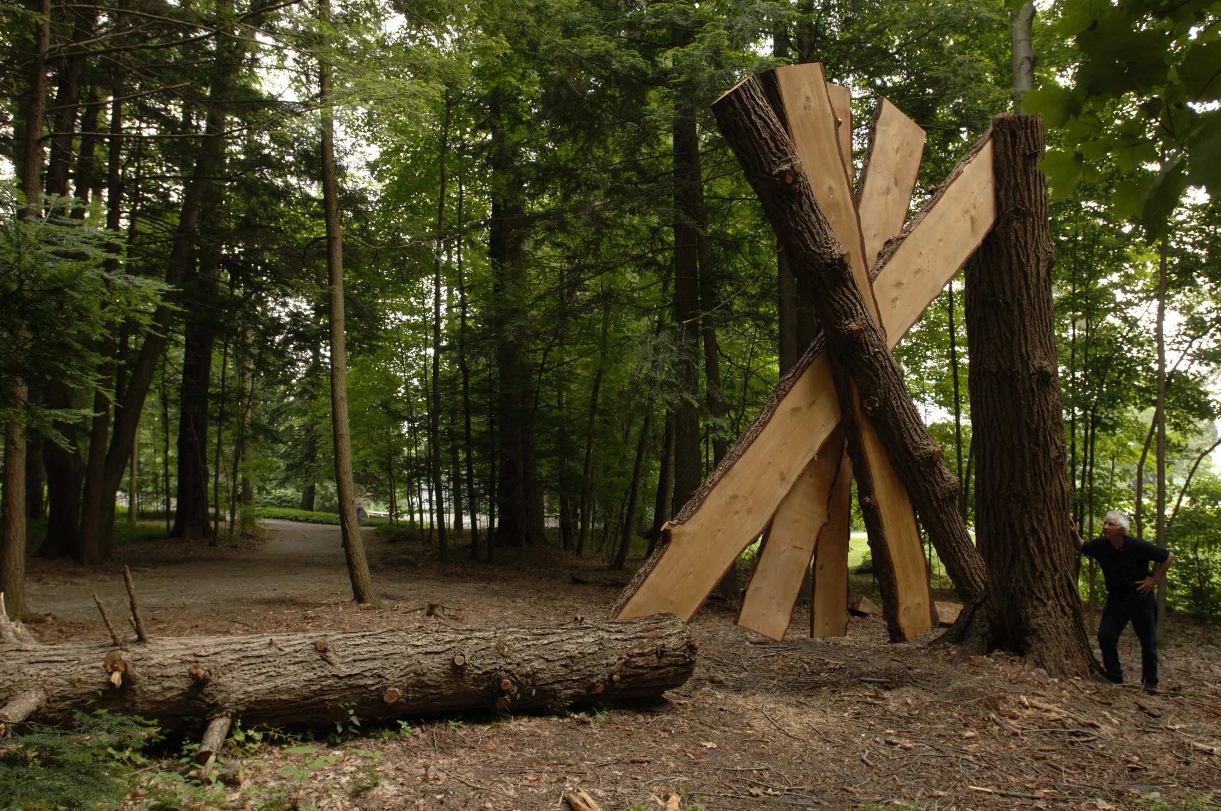Housatonic at Stockbridge, a site-specific environmental installation at Chesterwood National Historic Trust, the home of Daniel Chester French, constructed from two full growth standing dead Scott pine trees located in the garden yard. The trees were cut leaving the base of one of the Scott pines and the body of the piece is milled into all the parts of the sculpture and reassembled on site re- connected to the top of the tree.