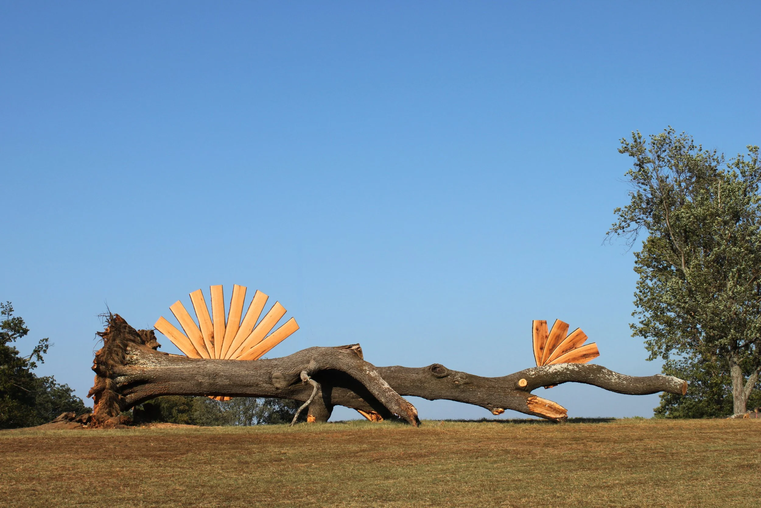 Sacagawea, a site-specific environmental installation in Charlottesville, VA, constructed from a full grown oak tree that fell in a storm. The piece was made from sections of the tree removed, milled into slabs and reassembled back into the tree.